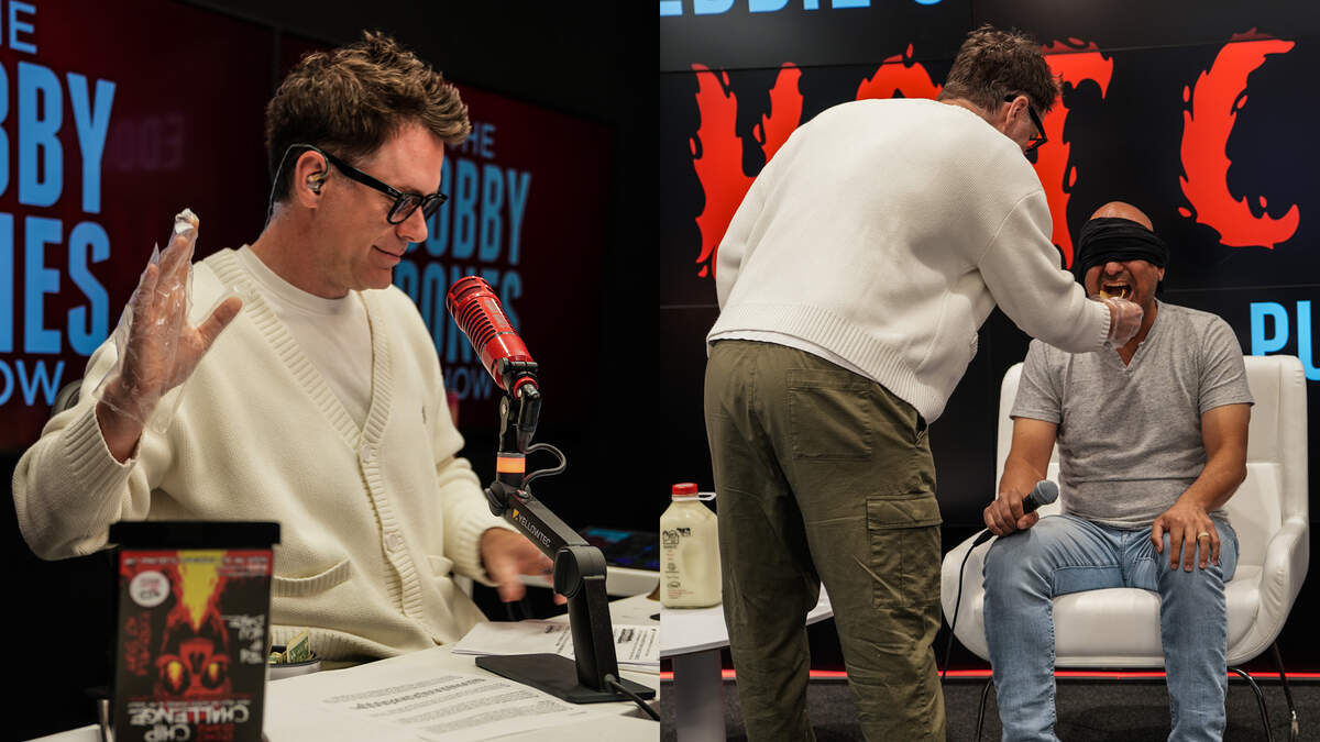Eddie picked number 1 to be the chip that he ate, it was in his head all day because he didn't think they would put the hottest chip at number 1. Bobby put on the glove and walked it over to Eddie to feed him since he was blindfolded. Thankfully for Eddie, he chose a plain chip and it wasn't the hottest chip.